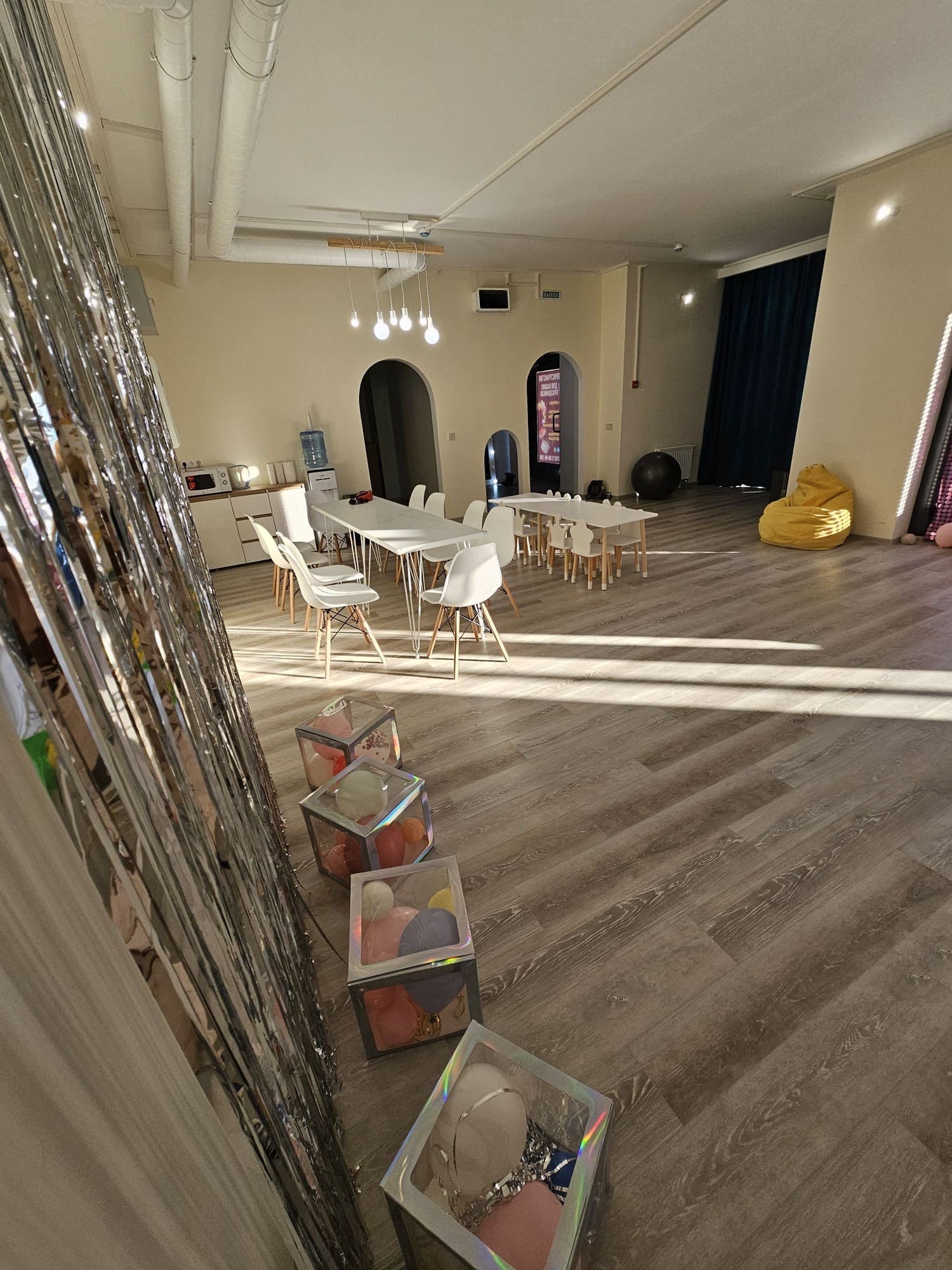 Очень красивый, ЧИСТЫЙ, свежий лофт для детских праздников. Очень продуманно сделана детская зона, много игрушек, бассейн с шариками, горка, качели и многое другое для развлечения детей даже без аниматора (но с аниматором конечно лучше😁). Есть все необходимое и для взрослых посиделок: детские столы и отдельно детский стол это отличное решение 👍🏼, одноразовая посуда, чайник, удобные кресла мешки, музыка, светомузыка, много вариантов освещения от приглушенного света до яркого🔥 Есть возможность украсить самостоятельно зал, мы делали фотозону. Хочу также отметить очень приятную и отзывчивую хозяйку - Кристину. Всегда на связи, готова помочь, помогала устроить праздник. Очень советую к сотрудничеству и человека и с душой сделанное место. Вы не разочаруетесь 👌